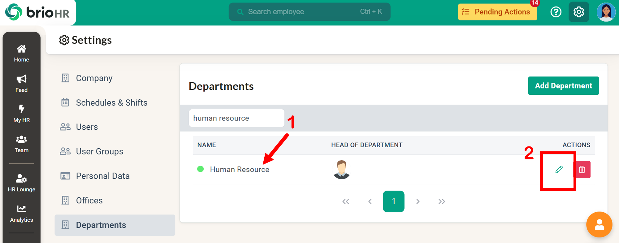 1. On the Departments page, locate the department you wish to update (e.g., Human Resources).