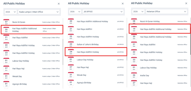 In line with this announcement, we've updated our system with the public holiday, "Hari Raya Aidilfitri Additional Holiday", on the 20th March 2026 that has been added for all offices in Malaysia.