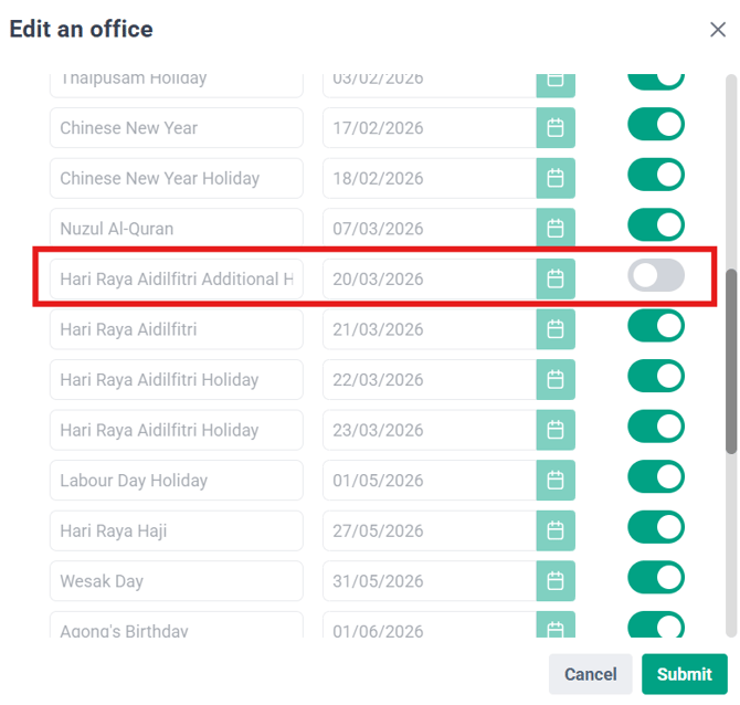 - Toggle off "Hari Raya Aidilfitri Additional Holiday"