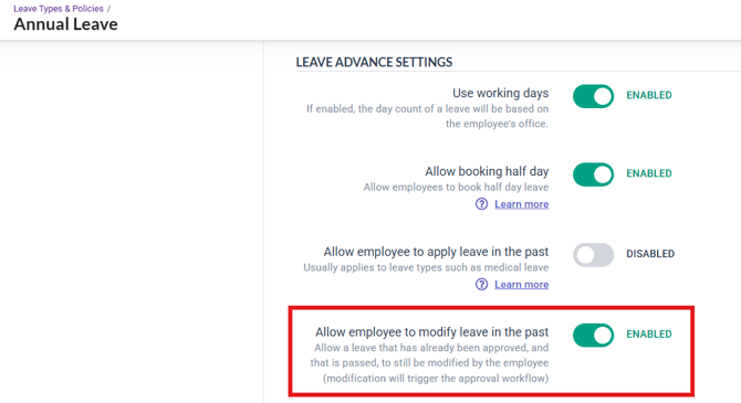 Check if “Allow employee to modify leave in the past” is enabled