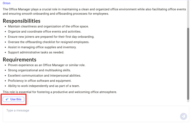 - Use the Orion interface to prompt, review, and edit the AI-generated job description as needed. Once you're happy with the description, click 'Use this' to add the description to the form.