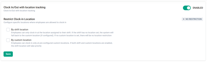 - If 'Restrict Clock-in Location' is disabled, the system will not restrict the location but will still record the employee's location during clock-in and out. Refer to [How to Enable Clock In/Out Location Tracking Without Location Restriction]