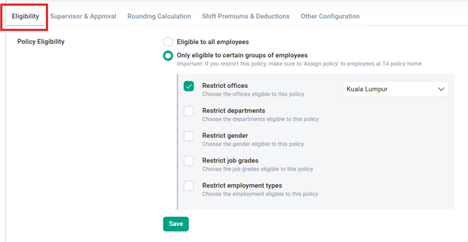 - Set up policy eligibility (either make it available to all employees or restrict it based on criteria)