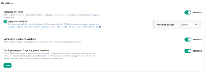 For more info on enabling 'Manager pre-approve overtime' and 'Employee request for pre-approve overtime', refer to the articles below: