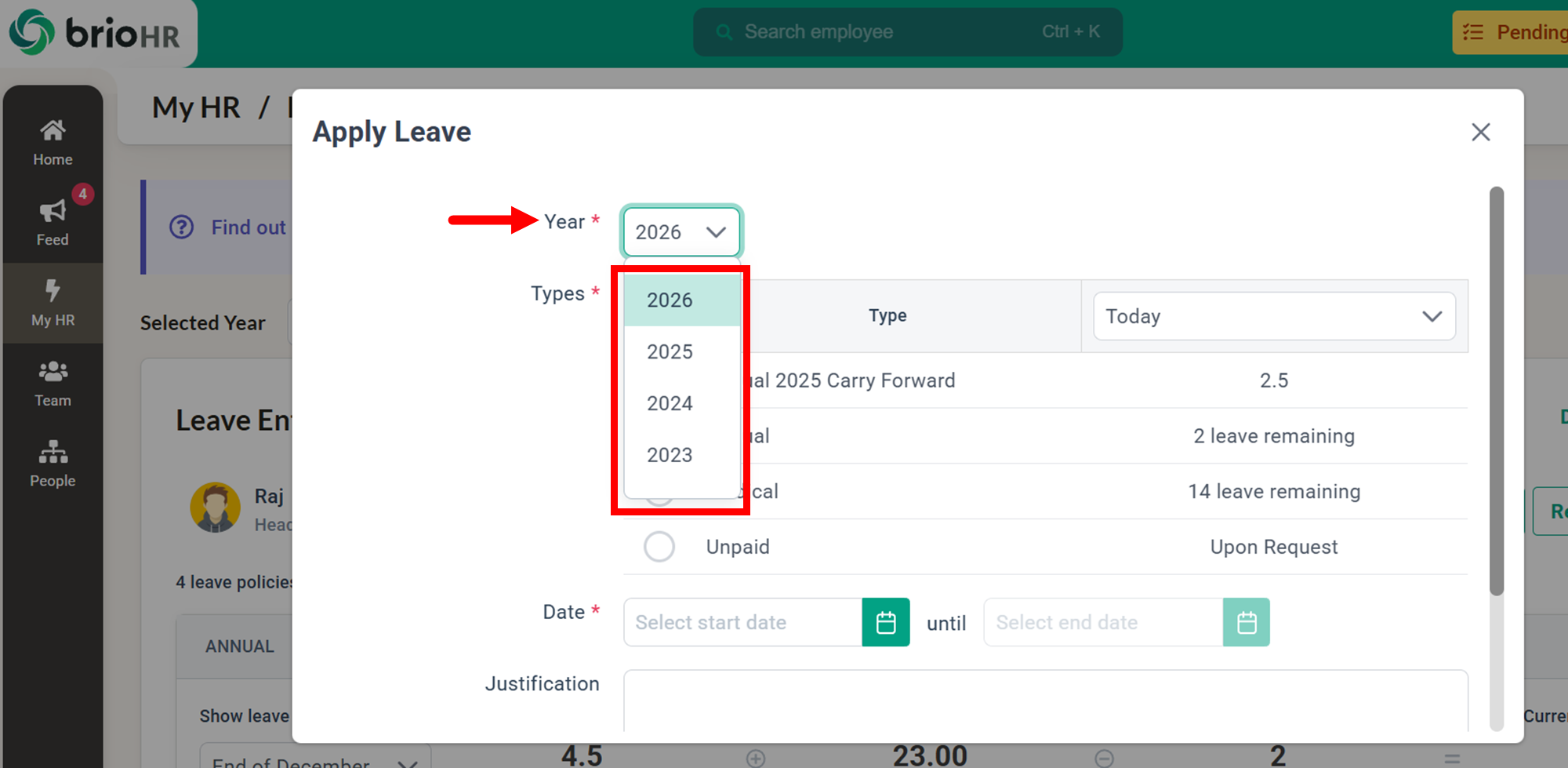 After enabling access, employees can select the next year rom the dropdown menu on the leave application page.