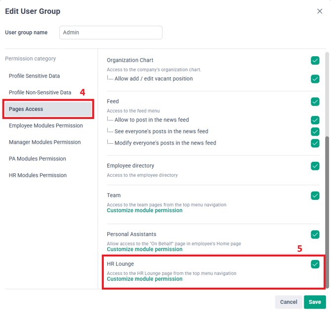 - Go to Pages Access > Tick the checkbox for HR Lounge