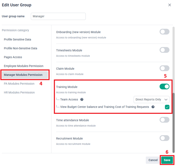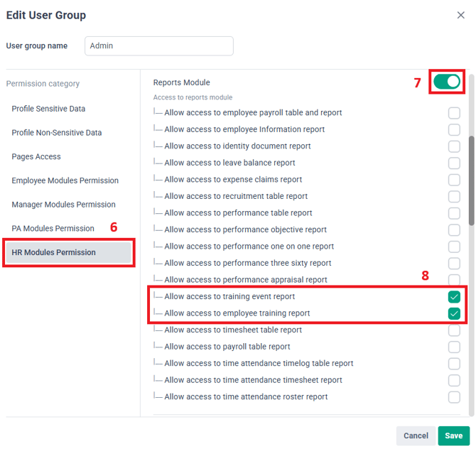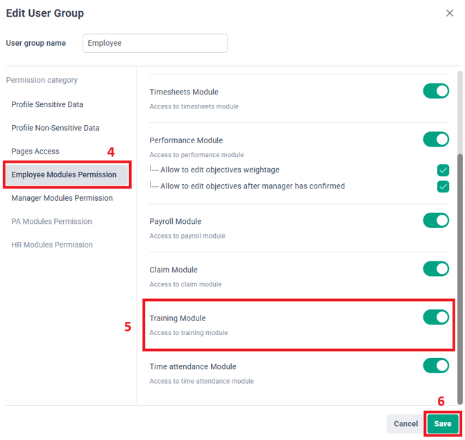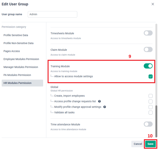6. Within HR Modules Permission, look for the Training Module and enable the toggle