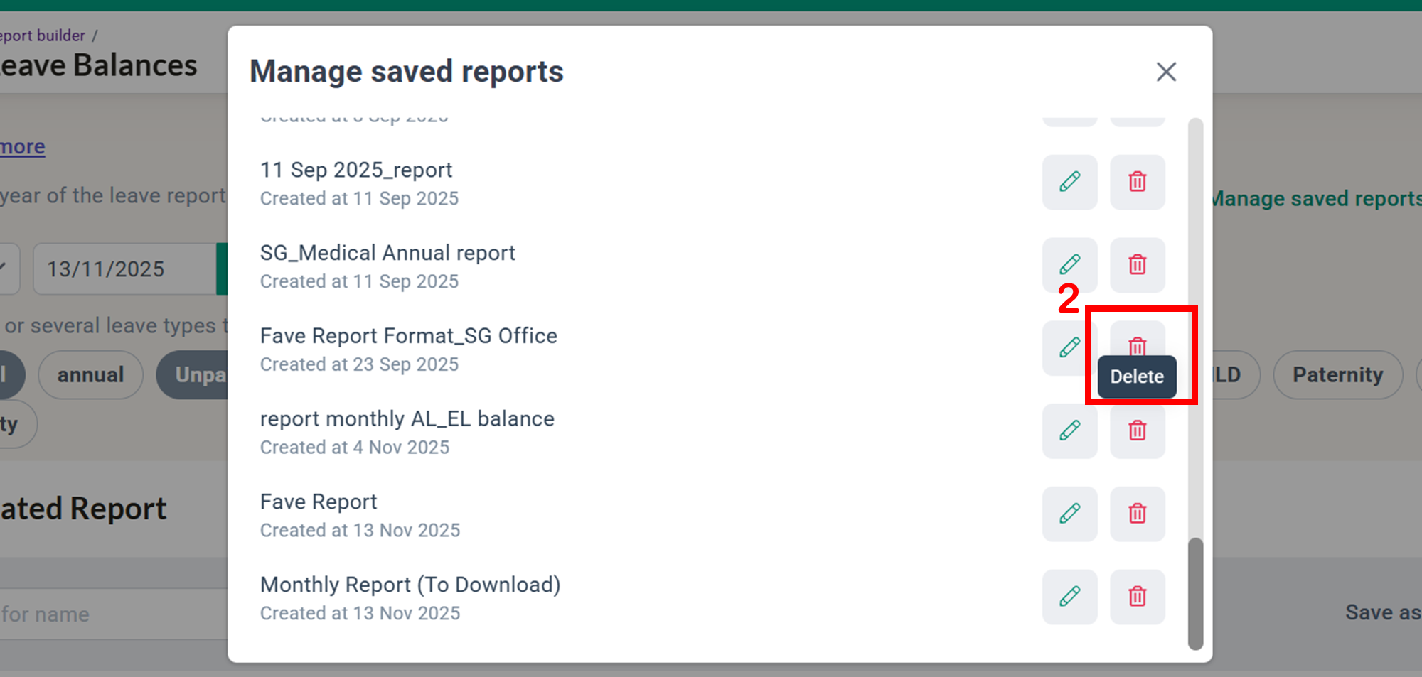 Deleting a saved format does not affect your existing leave records - only the saved layout is removed.