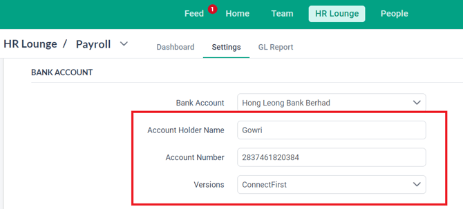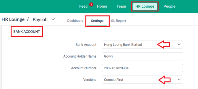 - Go to Settings, scroll down to the Bank Account section, and in the "Bank Account" field, select Hong Leong Bank Berhad and the version ConnectFirst