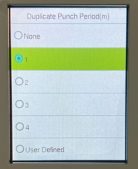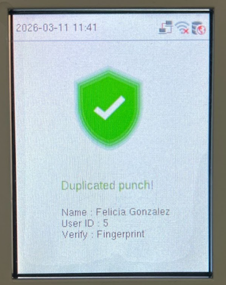 If an employee attempts to tap the clock again within the restricted time range, the device will display a duplicate punch warning message.