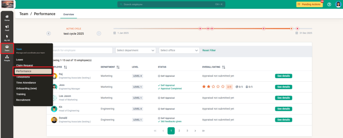 To begin reviewing your team’s performance activities, navigate to Team > Performance within the BrioHR platform. This section provides access to the Performance Dashboard, where you can oversee and manage all performance-related tasks for your team members.