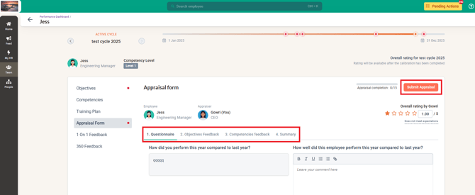 Once the appraisal form has been submitted by the employee, as a manager, it will appear in your queue for manager (appraiser) review.You will then need to evaluate their responses and provide your feedback.