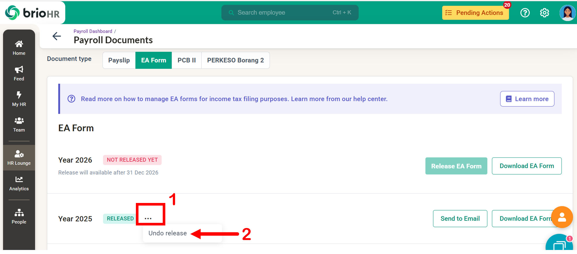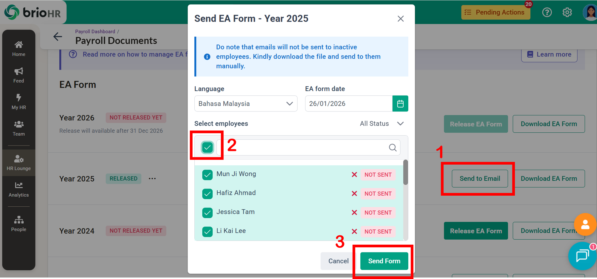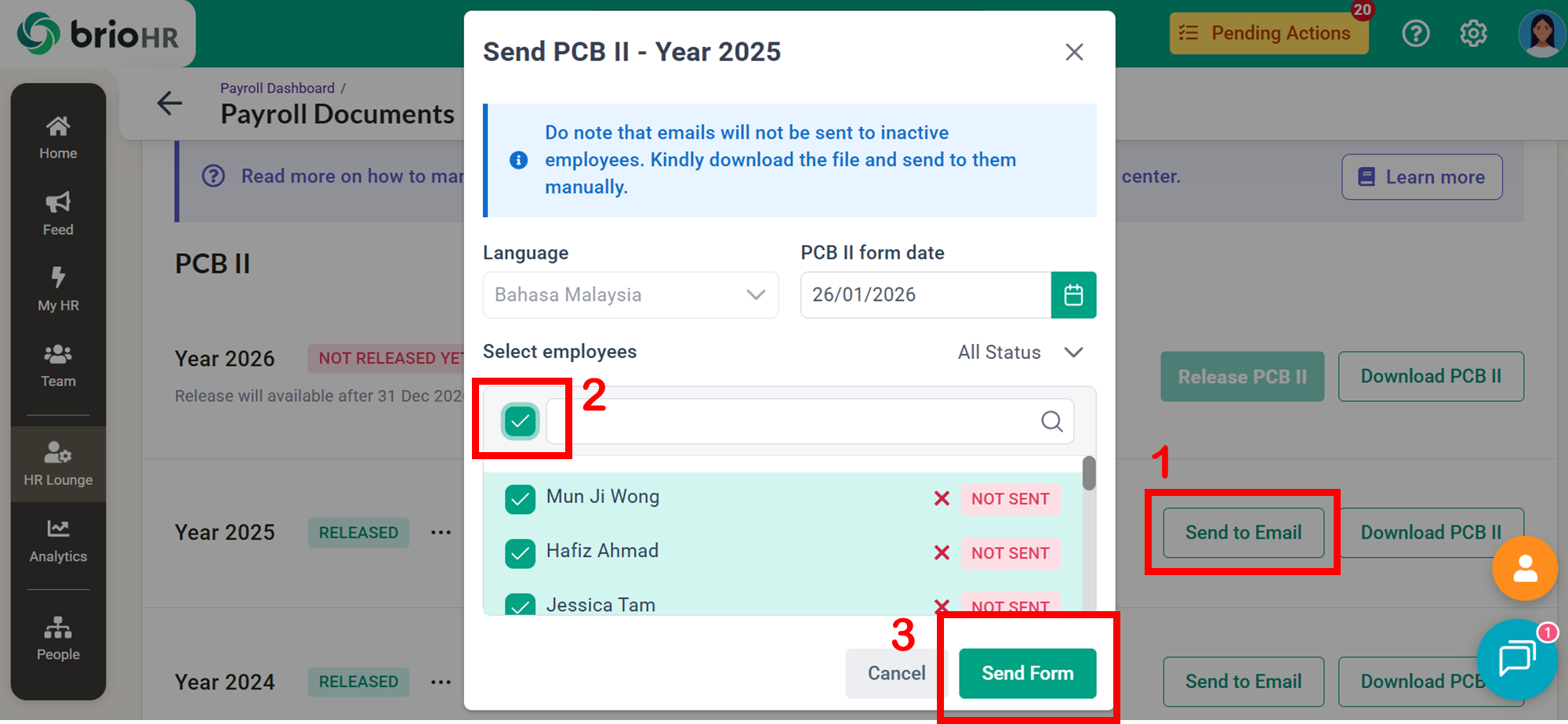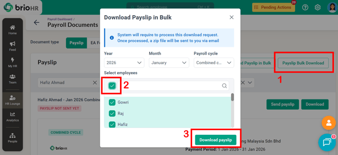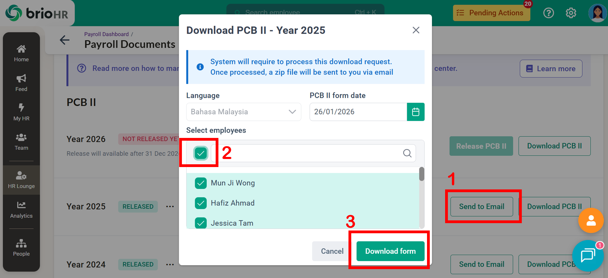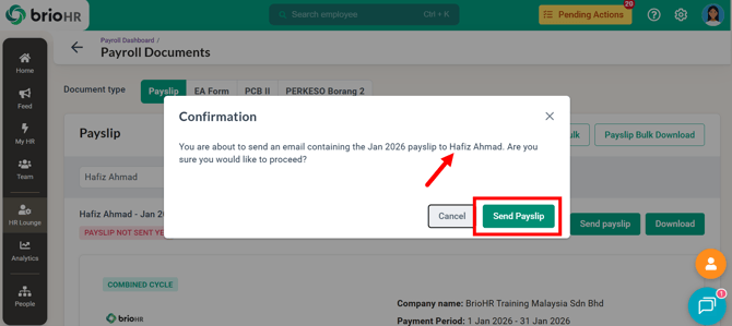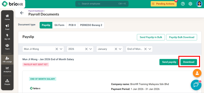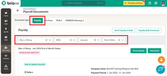 Learn how to access, send, download, and manage employee Malaysia payroll documents in BrioHR, including payslips, EA Forms, PCB II Forms, and PERKESO Borang 2.