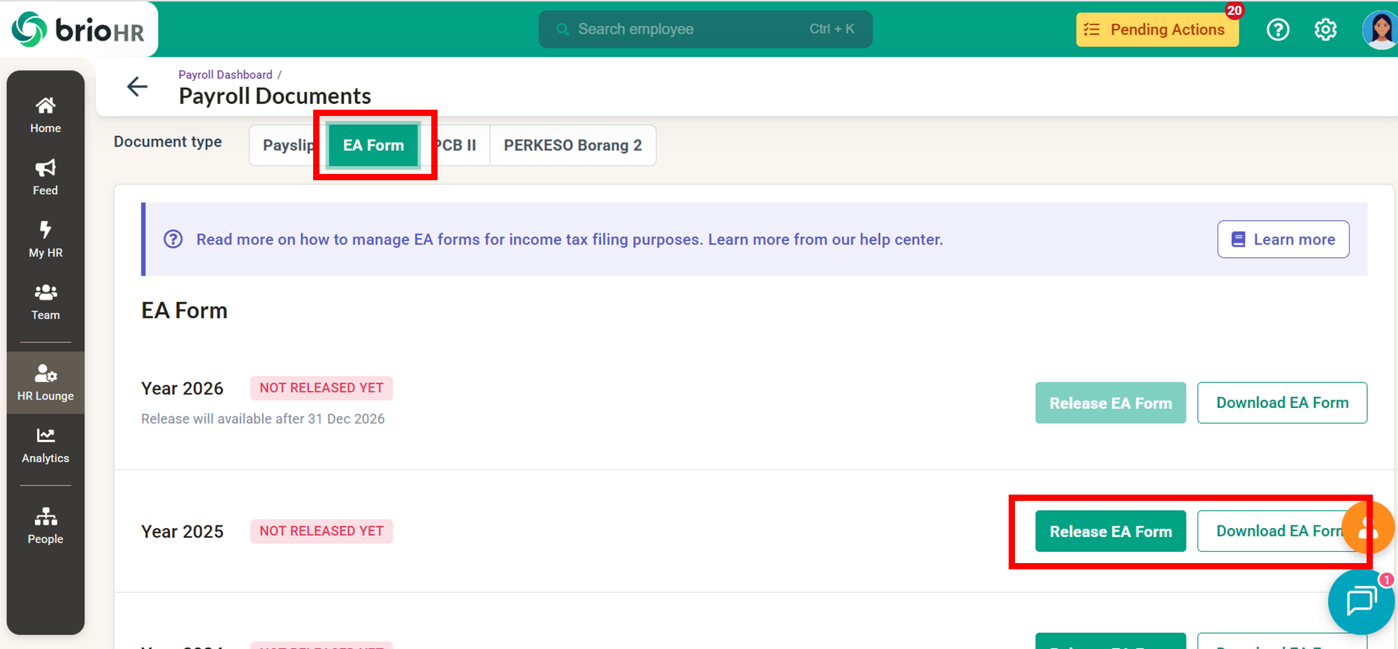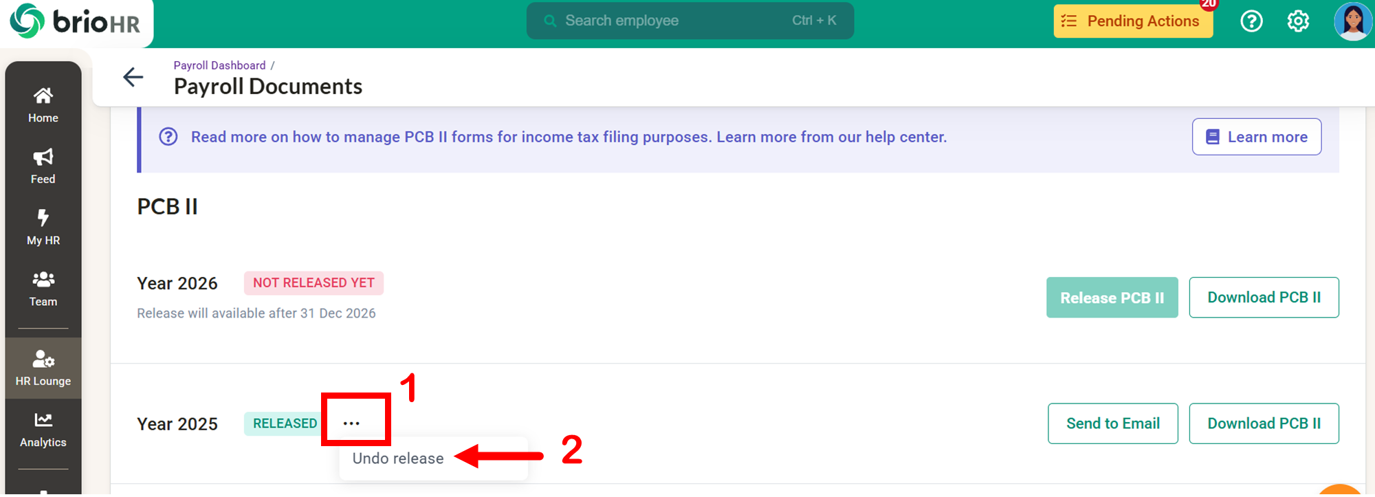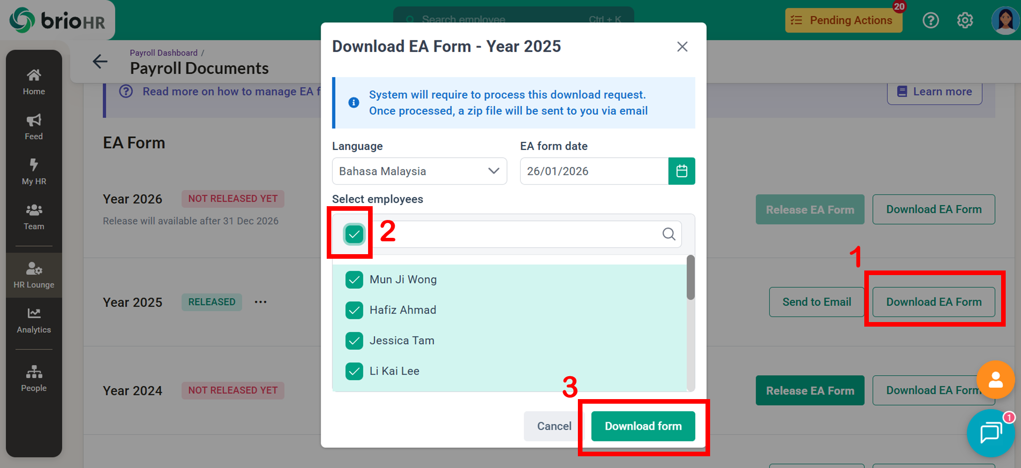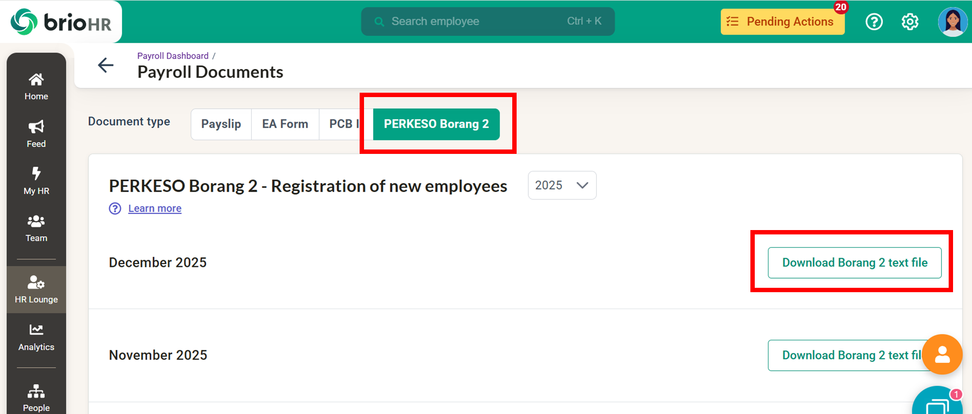 Learn how to access, send, download, and manage employee Malaysia payroll documents in BrioHR, including payslips, EA Forms, PCB II Forms, and PERKESO Borang 2.