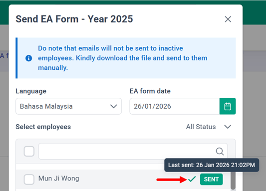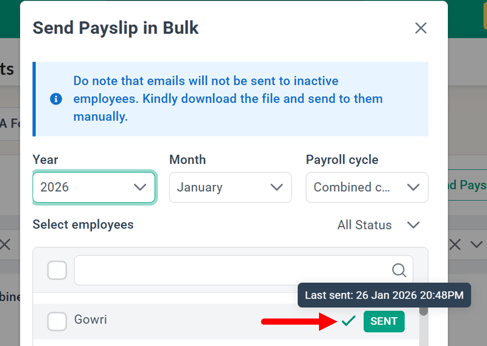 For payslips with a "SENT" status, hover over the status to view the date and time stamp indicating when the payslip was sent.