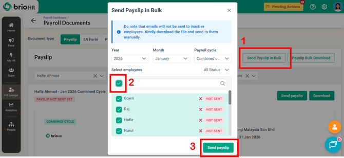 Click on the "Send Payslip in Bulk" icon, then: