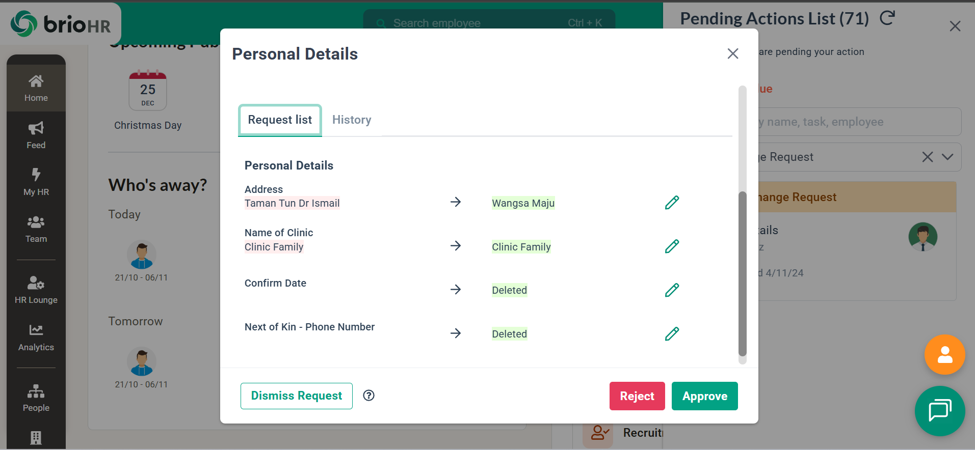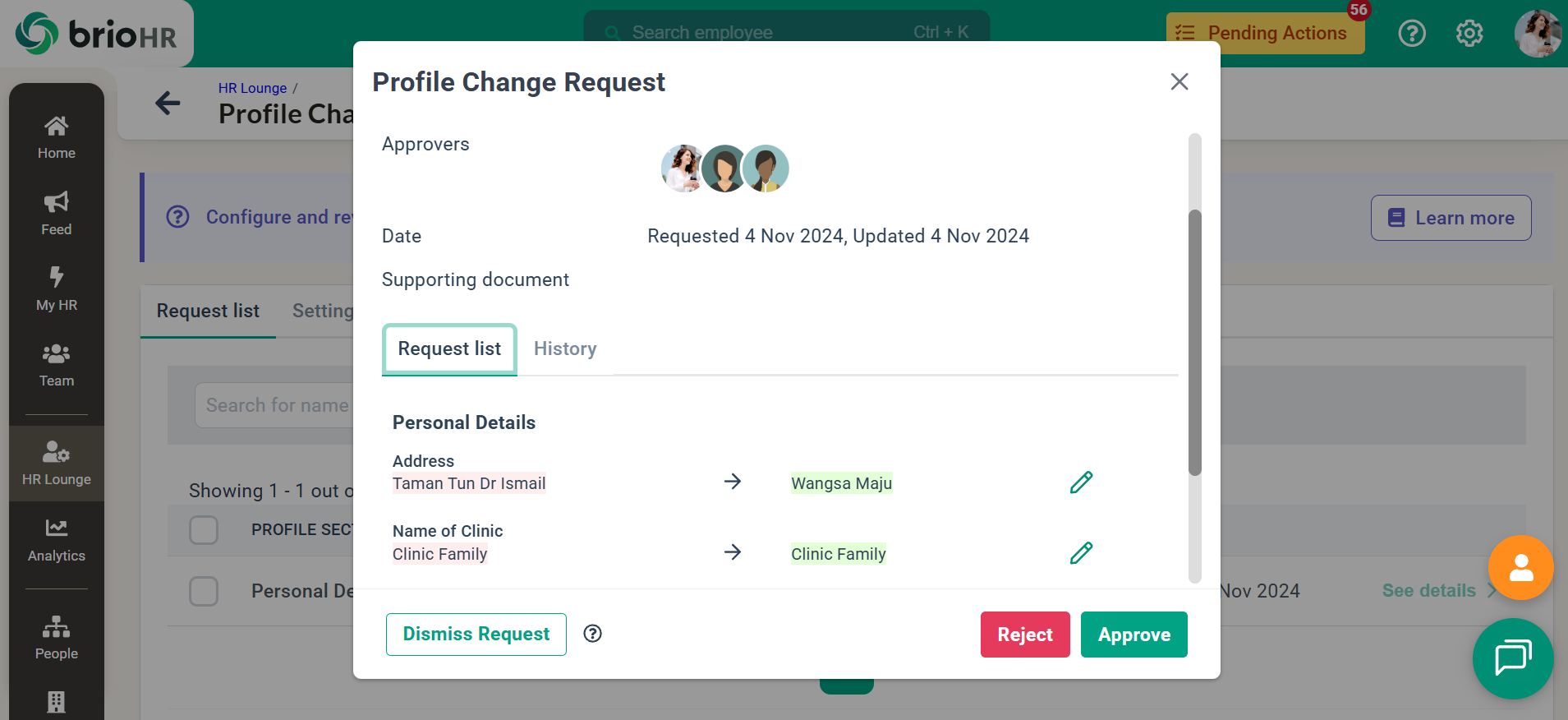 Learn how HR or approvers can review, approve, or reject employee profile change requests in BrioHR. Follow this step-by-step guide to ensure accurate and compliant employee data management.
