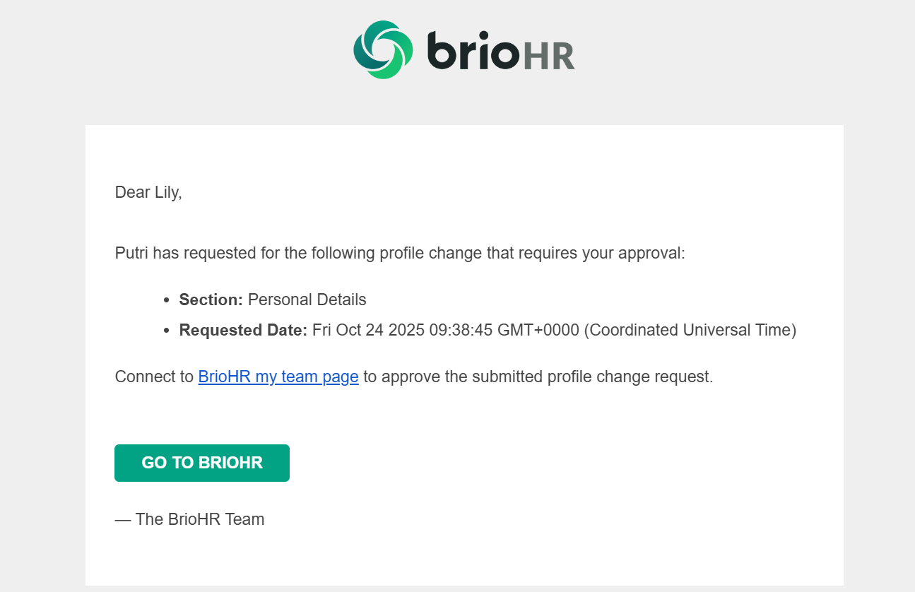 Whenever an employee submits a profile change request, the approvers will receive notifications through:- Email notification (sample below)