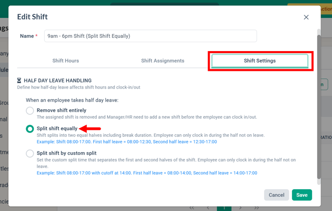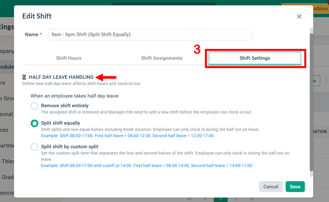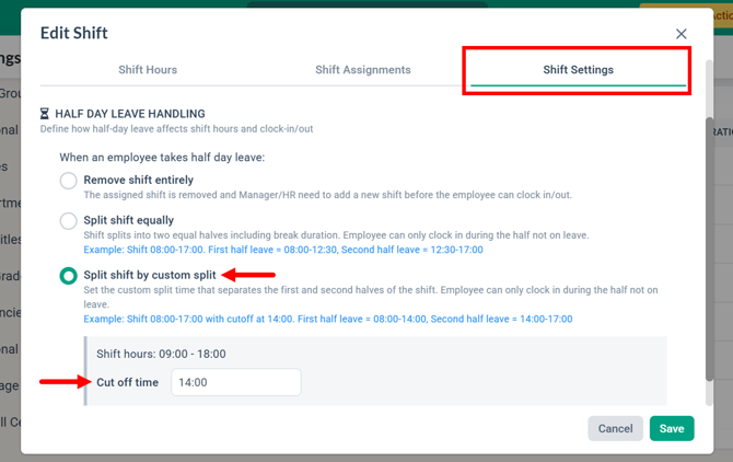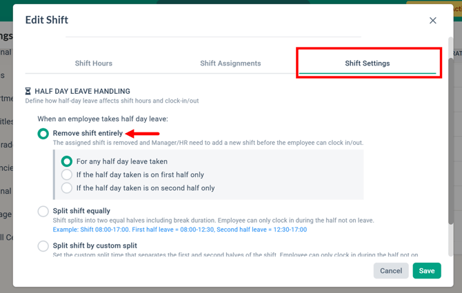 3. Under Shift Settings, locate the Half-Day Leave Handling section.