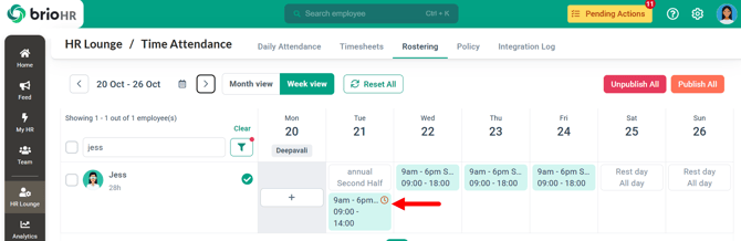 The shift - whether removed entirely or split into halves - will be automatically reflected in the employee’s timesheet and rostering.