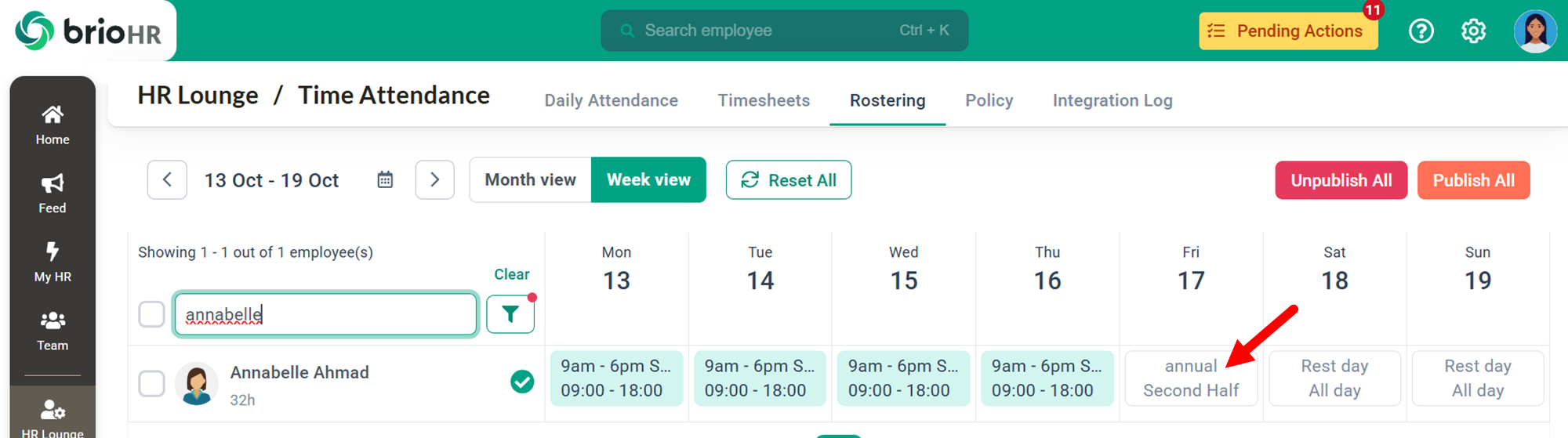 If an employee applied for half-day leave before this setup was made, you will need to reset the rostering for that period to apply the new changes.