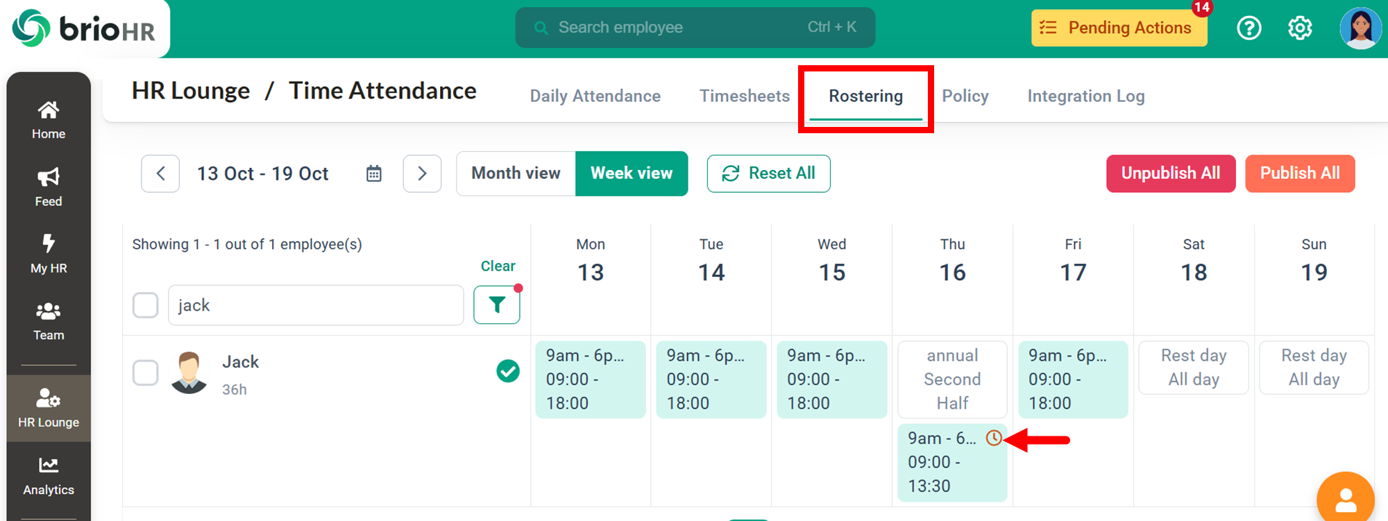 If an employee applies for the morning half-day leave, their clock-in time will begin at 2:00 PM, and their adjusted shift will display automatically in Daily Rostering and Timesheet.