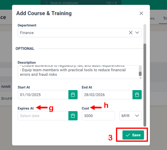 - Cost (Optional): Add the estimated or actual cost of the training.