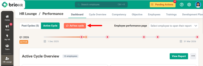 The Ad-Hoc Performance Cycle is an exciting feature in the BrioHR Performance Management module. It allows HR Admins to create a separate appraisal cycle for specific employees, independent of the main performance cycle.