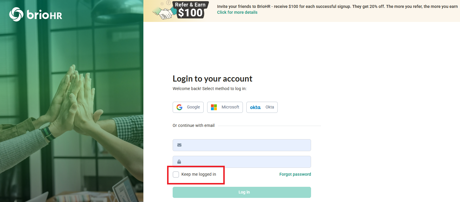 If “Keep me logged in” is checked and the user logs in today, they can continue using BrioHR on the same laptop and browser for the next 30 days without needing to log in again. On day 31, they will be prompted to log in.