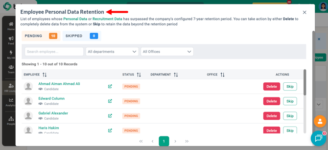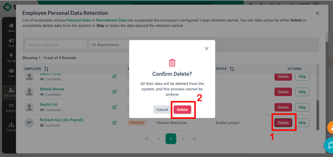 BrioHR supports Personal Data Retention to help organizations comply with data protection and privacy regulations. This feature allows HR users to retain or delete personal data once it exceeds a defined retention period.