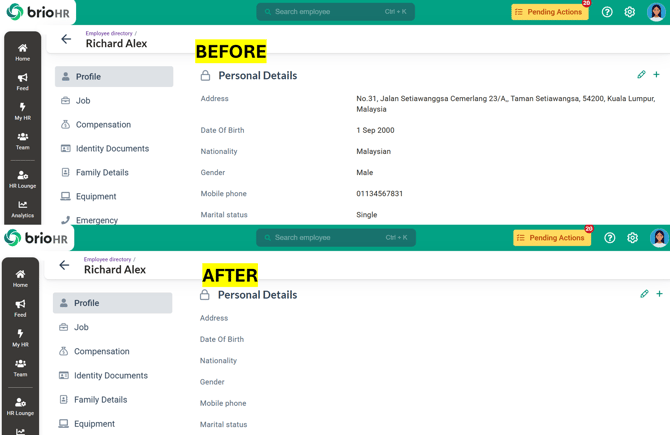 Below is an example showing how a resigned employee's personal details are deleted through Personal Data Retention.