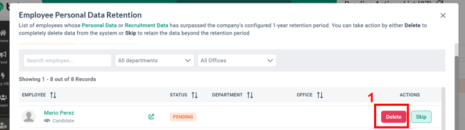 When a resigned employee’s employment end date + retention period (e.g. 7 years) is reached, the assigned users will receive a notification to take action. The same logic applies to candidate profiles, based on how long the data has been stored in the system.