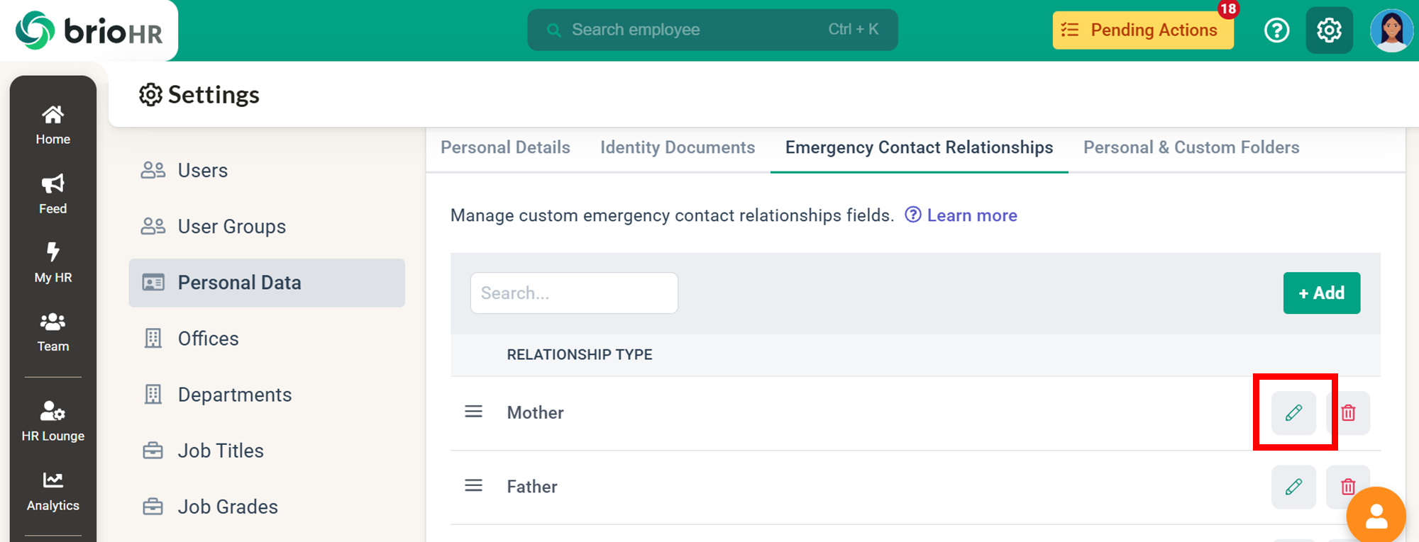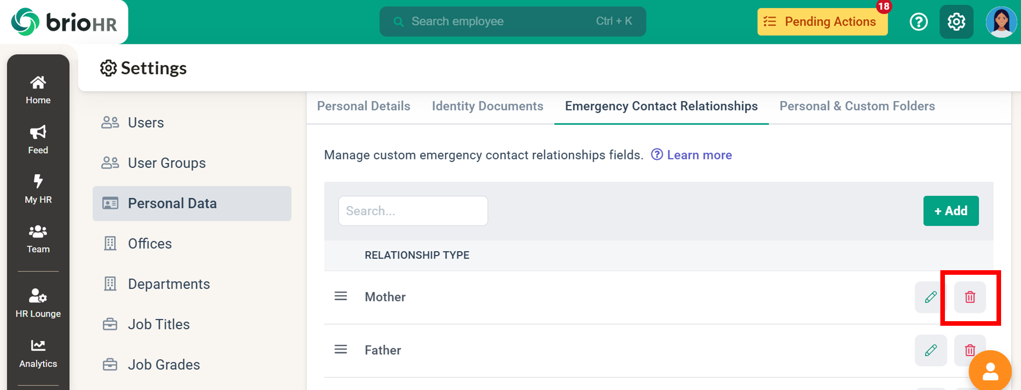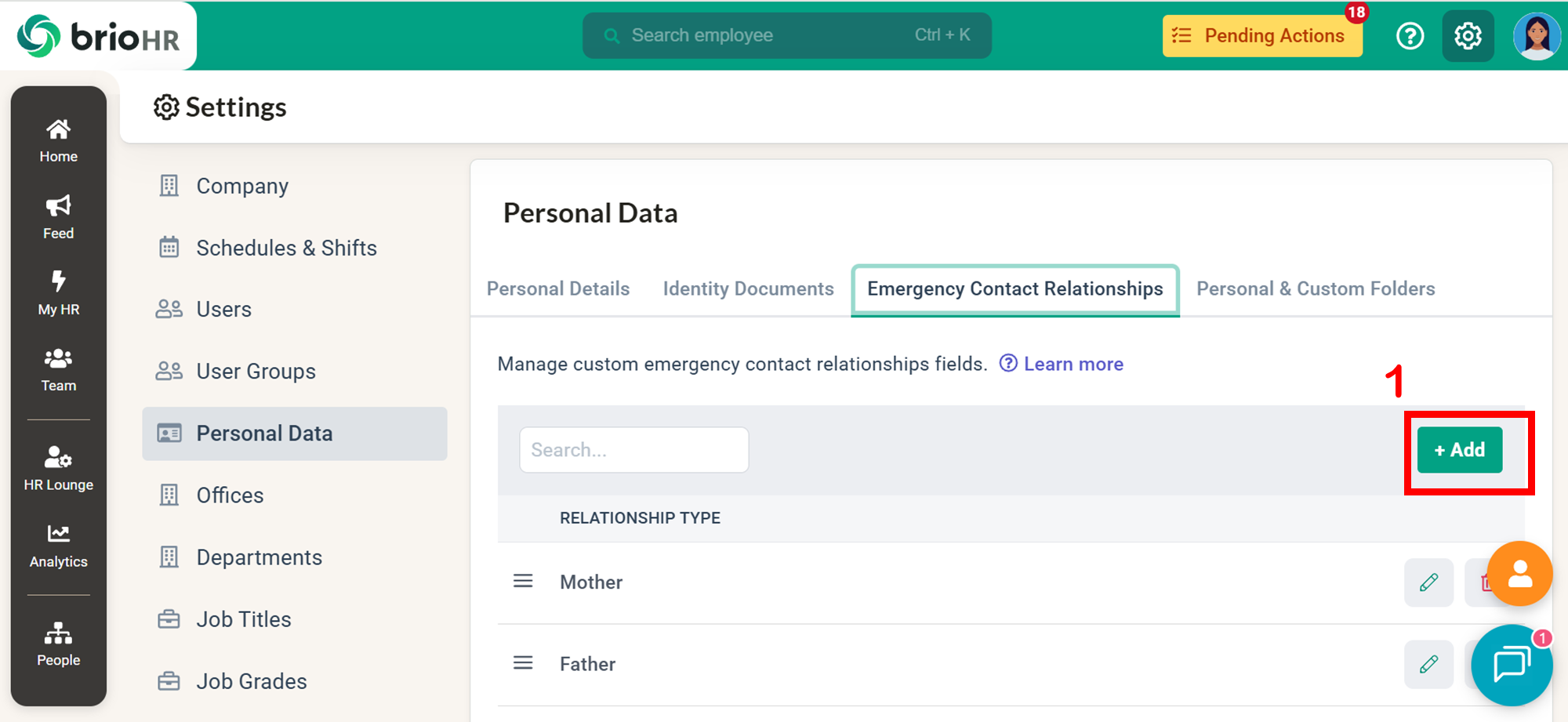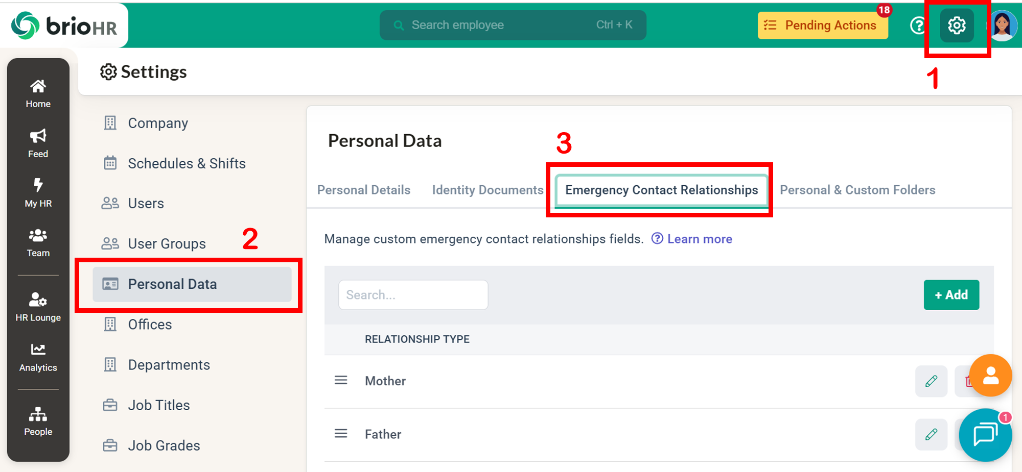 Learn how to add, edit, or delete emergency contact relationship types in BrioHR. This guide explains how to customise relationship options beyond family members and manage them easily in Settings.