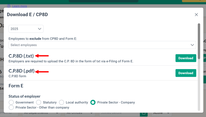 Navigate to HR Lounge > Payroll > Quick Actions > Form E/CP8D > Download.