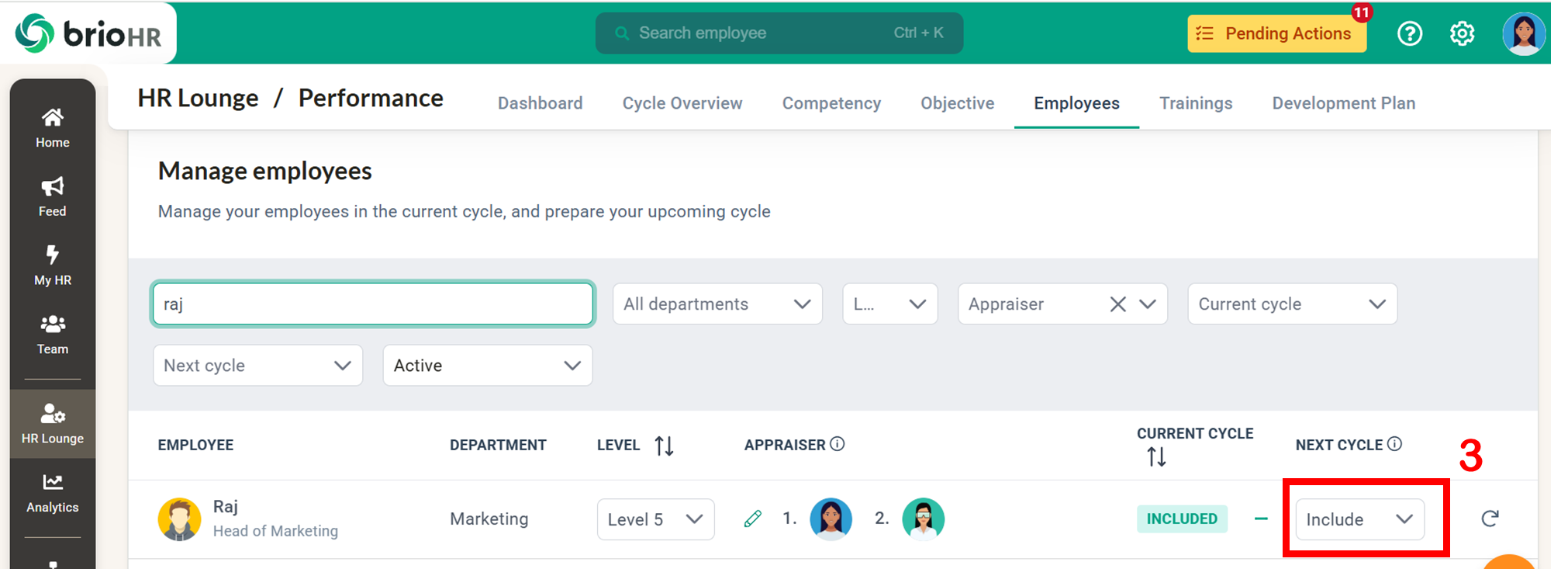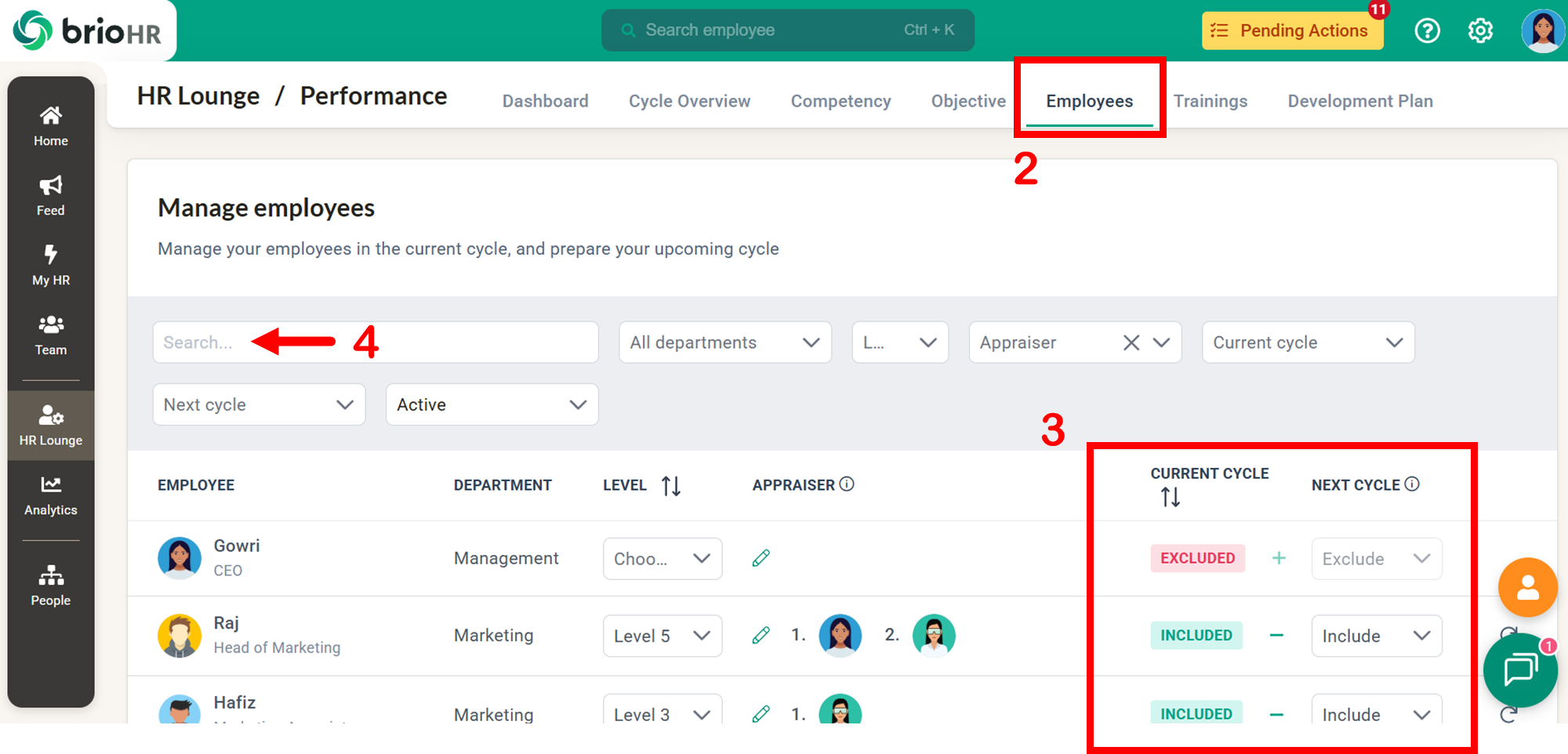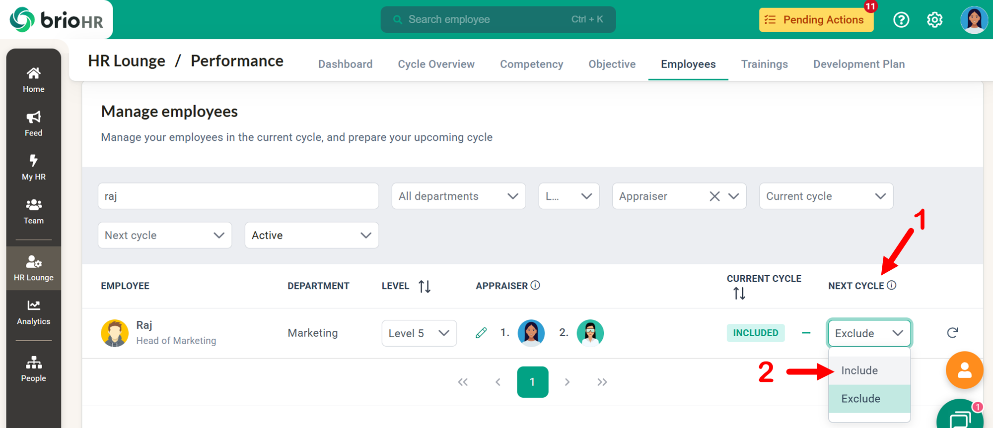 BrioHR allows Admin or HR users to easily manage employee participation in both the current and upcoming performance cycles.