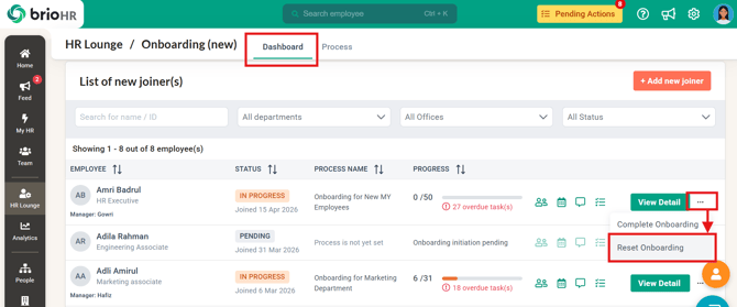 To reset the onboarding process for a new employee, follow these steps: