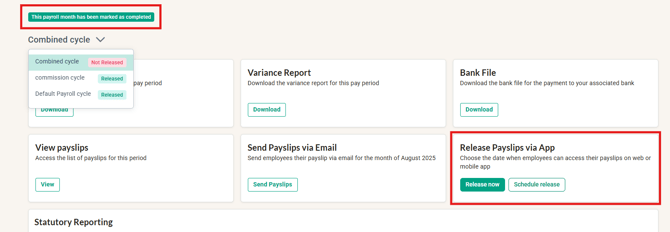 For Payroll Months which have more than one payroll cycle (eg, Default Salary cycle + Commission cycle in a singular month), the Combined cycle payslip will only be available to be released once the Payroll Month has been completed on the system
