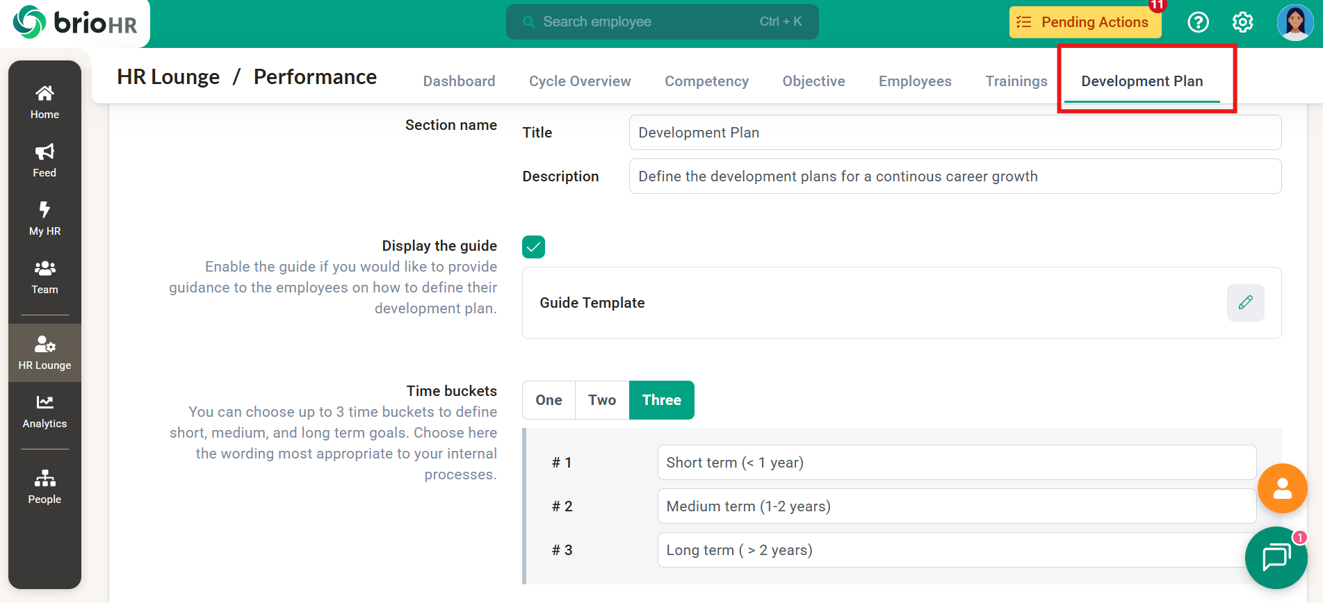 The Development Plan helps employees track their personal growth objectives. Although it’s linked to the performance cycle, it does not affect the performance score and can continue even after the cycle ends.