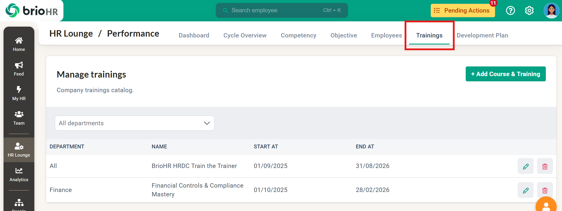 HR Admins can create a list of trainings or courses relevant to the performance cycle. While training attendance occurs outside BrioHR, this list helps record which courses employees have completed during the review period.