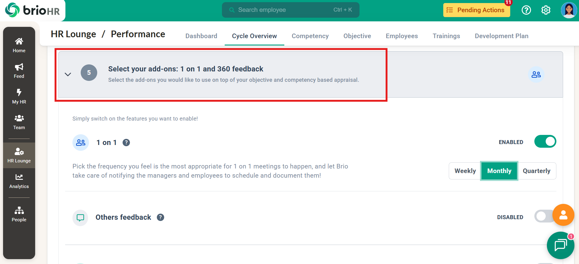 Learn how to set up and launch a performance cycle in BrioHR, including configuring competencies, objectives, key milestones, and optional add-ons like 1-on-1 and 360 Feedback.