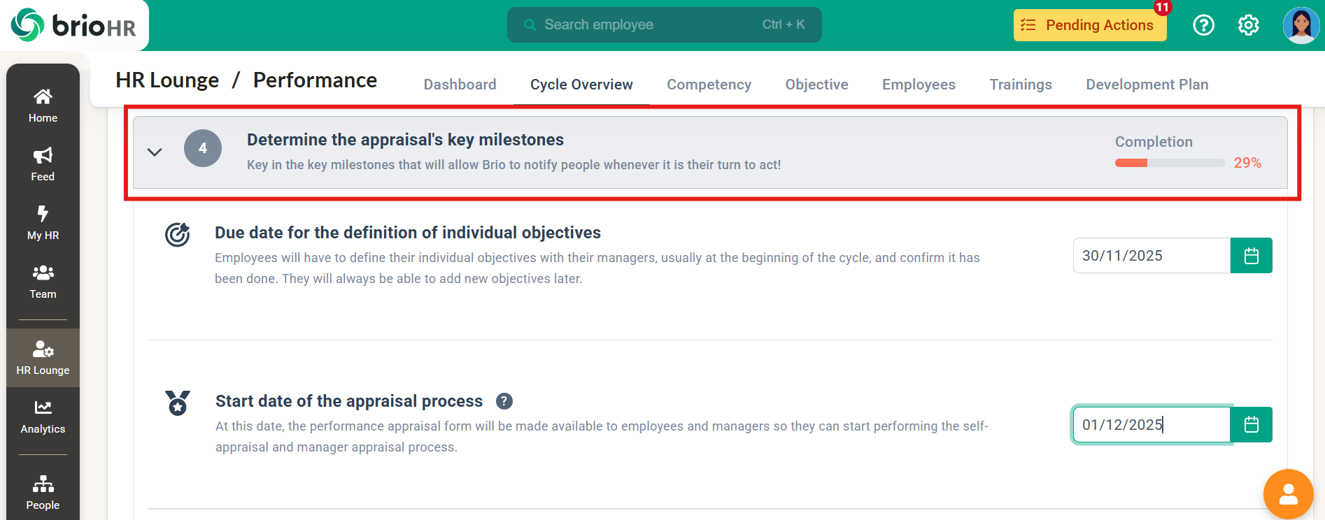 Before launching a performance cycle and making it accessible to all employees, you must first set up the performance cycle framework under the Cycle Overview section of the Performance Module in BrioHR.