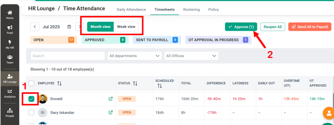 You can choose to approve timesheets for the entire month by selecting' Month View', or approve for a specific week by selecting 'Week View'.