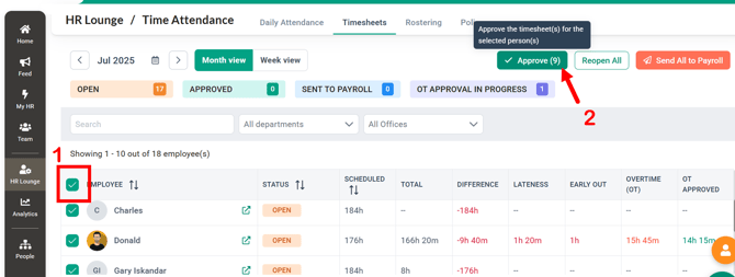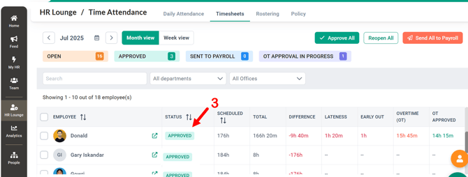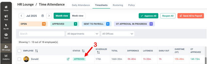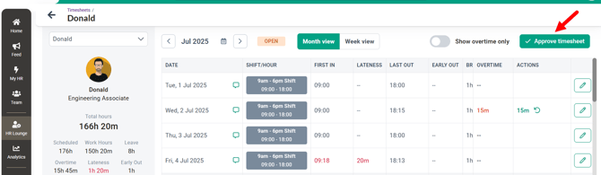 Once a timesheet is approved, no further modifications can be made to attendance records. This is also the first step before sending the timesheet to the payroll cycle for overtime payment calculations.