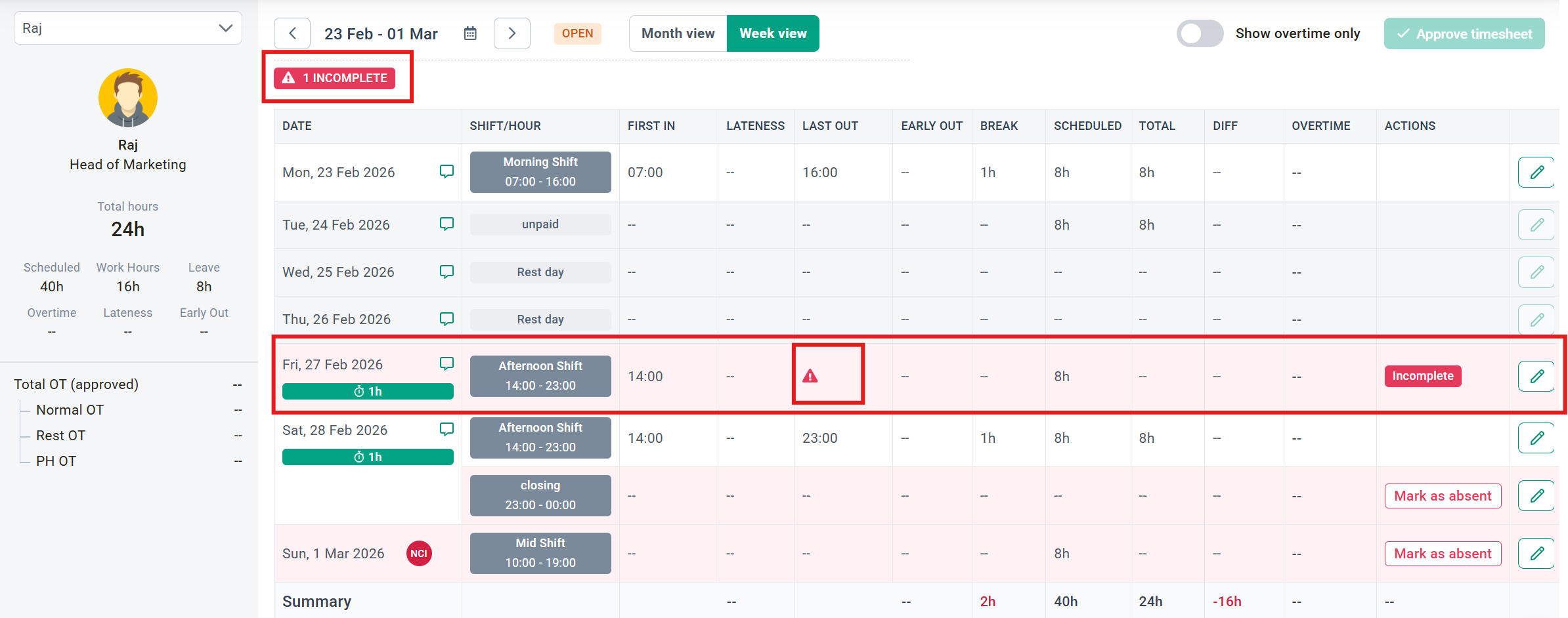Please ensure that the timesheet is not missing any Clock Out time. Timesheets with missing clock-out data will be labelled 'Incomplete'. You will not be able to approve timesheets with incomplete clock-out data. Edit the clock-out data to complete the timesheet. Then, you will be able to approve it.