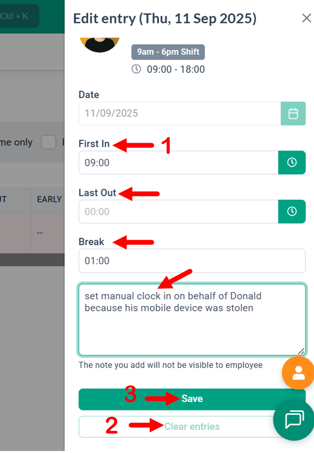 With BrioHR, managers can perform manual attendance entry to edit clock-in (First In), clock-out (Last Out), and break durations. This ensures that employee timesheets remain accurate for payroll and compliance purposes.