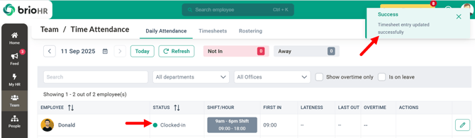 After saving the manual attendance entry, a success message will appear. The employee’s attendance status for the day will update from Not Clocked-In (NCI) to Clocked-In (CI).
