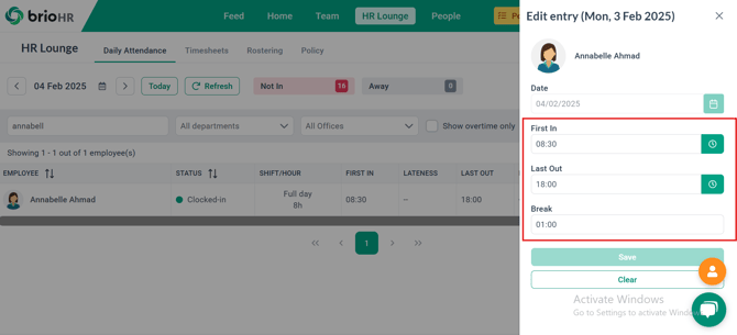 HR Admins can manually enter attendance records to edit clock-in (first in), clock-out (last out), and break durations, ensuring accurate daily timesheets for employees.