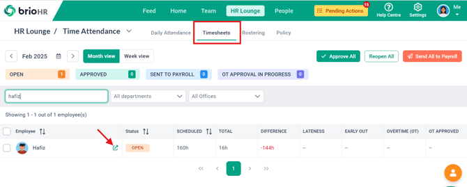 - Click the employee's name, or the "open in new browser" to open the employee's timesheet'