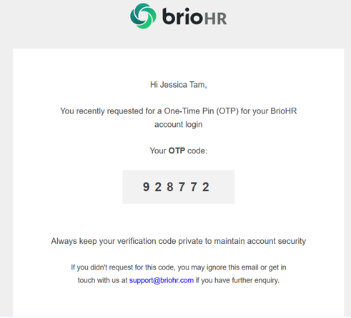 2. Search for an email titled "BrioHR One Time Pin (OTP)" for the verification code sent by BrioHR.