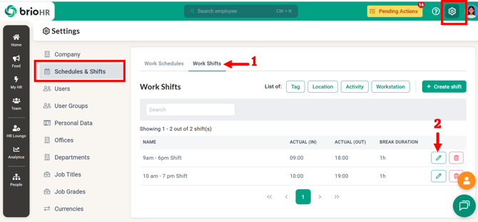1. In your BrioHR account, go to Settings > Schedules & Shifts > Work Shifts.